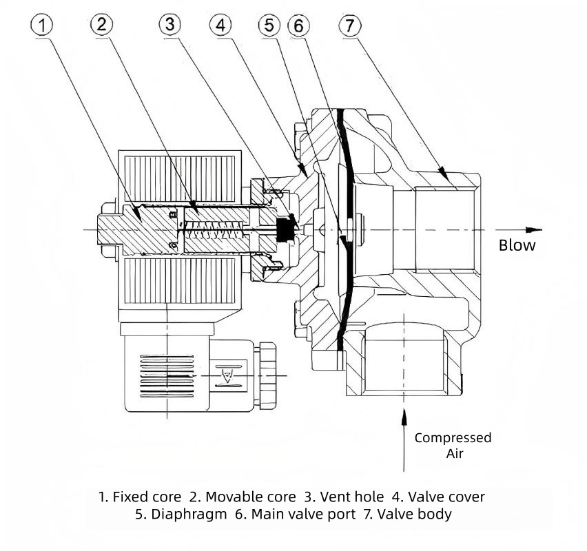 ການກະຕຸ້ນ diaphragm: ດໍາເນີນການໂດຍຄວາມແຕກຕ່າງຂອງຄວາມກົດດັນ pneumatic. ເມື່ອມີພະລັງ, ຫົວ solenoid ຈະເປີດພອດບັນເທົາທຸກເພື່ອລະບາຍຄວາມກົດດັນຂອງຫ້ອງຫລັງ, ອະນຸຍາດໃຫ້ອາຍແກັສຫ້ອງດ້ານຫນ້າຍົກ diaphragm ສໍາລັບ blowback. ເມື່ອມີການເສື່ອມພະລັງງານ, ລະດູໃບໄມ້ປົ່ງຈະປິດທາງອອກ, ຟື້ນຟູສະພາບທີ່ປິດແລ້ວ.