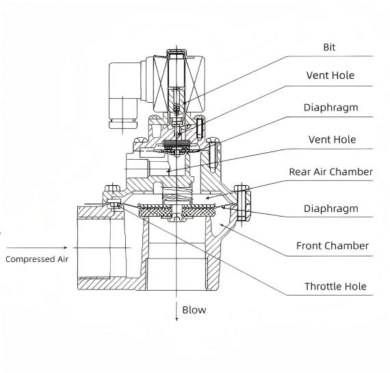 ຝາອັດປາກມົດລູກແບ່ງປ່ຽງກຳມະຈອນແມ່ເຫຼັກໄຟຟ້າອອກເປັນຫ້ອງທາງໜ້າ ແລະຫຼັງ. ເມື່ອອາກາດທີ່ຖືກບີບອັດຖືກສະຫນອງຜ່ານຮູສຽບເຂົ້າໄປໃນຫ້ອງຫລັງ, ຄວາມກົດດັນຂອງຫ້ອງຫລັງບັງຄັບໃຫ້ diaphragm ປິດປະທັບຕາປ່ຽງປ່ຽງ, ວາງປ່ຽງກໍາມະຈອນແມ່ເຫຼັກໄຟຟ້າຢູ່ໃນສະຖານະ "ປິດ". ເມື່ອສັນຍານໄຟຟ້າຈາກຕົວຄວບຄຸມ jet pulse ຢຸດ, solenoid valve armature reset. ທໍ່ລະບາຍອາກາດຂອງຫ້ອງຫລັງປິດ, ແລະຄວາມກົດດັນທີ່ເພີ່ມຂຶ້ນໃນຫ້ອງຫລັງບັງຄັບໃຫ້ diaphragm ປິດປະທັບຕາປ່ຽງປ່ຽງ, ກັບຄືນປ່ຽງ solenoid ກັບສະຖານະ "ປິດ". ປ່ຽງກໍາມະຈອນແມ່ເຫຼັກໄຟຟ້າຄວບຄຸມການເປີດແລະປິດຂອງພອດບັນເທົາທຸກຂອງຮ່າງກາຍວາວໂດຍຜ່ານສັນຍານໄຟຟ້າ. ໃນລະຫວ່າງການລະບາຍວາວ, ອາຍແກັສຄວາມກົດດັນໃນຫ້ອງຫລັງຈະຖືກລະບາຍອອກ, ໃນຂະນະທີ່ອາຍແກັສຄວາມກົດດັນໃນຫ້ອງດ້ານຫນ້າຈະຖືກກະຕຸ້ນໂດຍພອດສູນຍາກາດຂອງ diaphragm, ຍົກຝາອັດປາກມົດລູກເພື່ອເລີ່ມຕົ້ນການເຕັ້ນຂອງກໍາມະຈອນ. ເມື່ອຮ່າງກາຍຂອງປ່ຽງຢຸດການໂຫຼດ, ອາຍແກັສທີ່ມີຄວາມກົດດັນຈະຕື່ມໃສ່ຫ້ອງຫລັງຢ່າງໄວວາໂດຍຜ່ານຮູທີ່ປຽກຊຸ່ມ. ເນື່ອງຈາກຄວາມແຕກຕ່າງຂອງພື້ນທີ່ຮັບຜົນບັງຄັບໃຊ້ທັງສອງດ້ານຂອງ diaphragm ຕໍ່ກັບຮ່າງກາຍປ່ຽງ, ຜົນບັງຄັບໃຊ້ອາຍແກັສຢູ່ໃນຫ້ອງຫລັງກາຍເປັນເດັ່ນ. ອັນນີ້ປິດຝາອັດປາກມົດລູກຢ່າງໜ້າເຊື່ອຖືໄດ້ຜ່ານຮູປ່ຽງປ່ຽງ, ຢຸດການໄຫຼຂອງປ່ຽງປ່ຽງ.